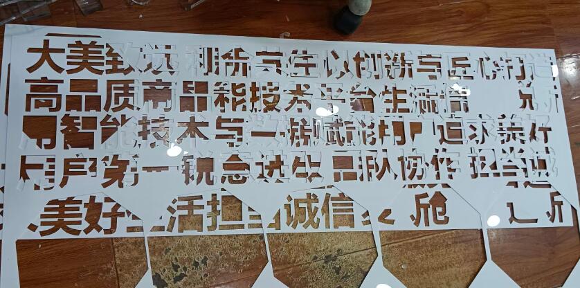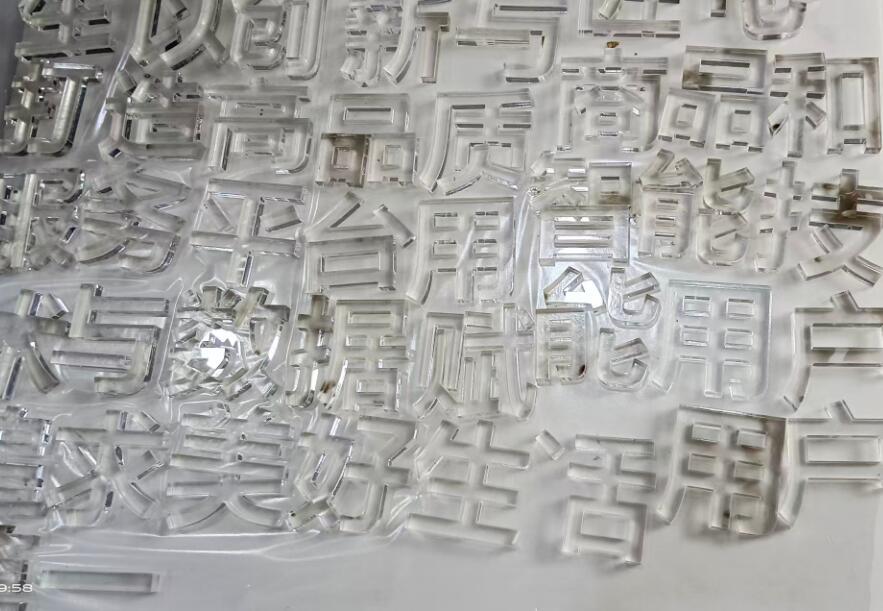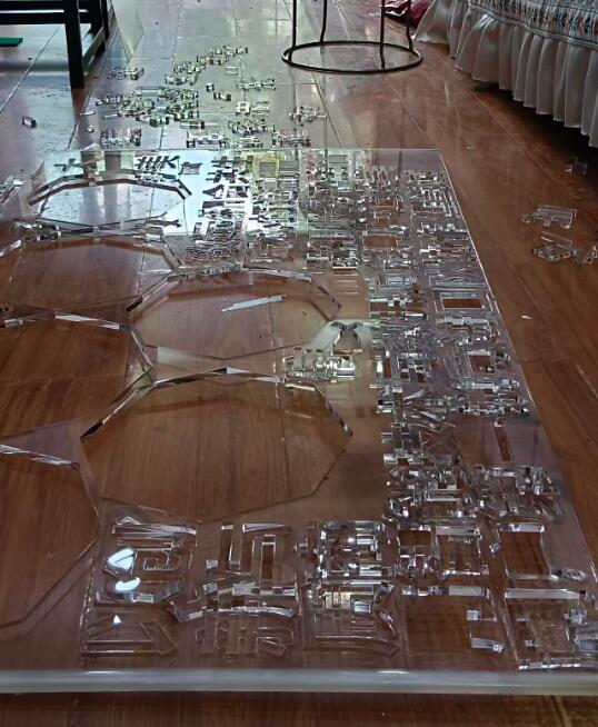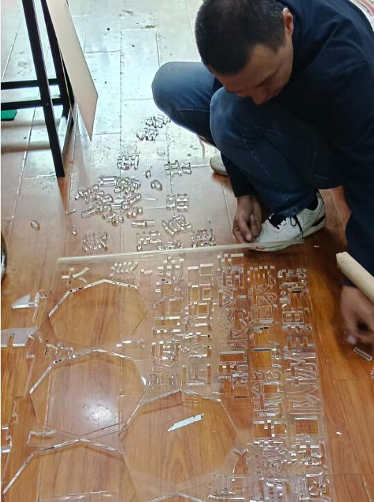 春蕾广告李老板把要制作的文化墙在电脑端设计完整,然后才让激光雕塑机开始制作,首先要将雕刻机加工好的文字,字母,图形等要一一核对,一点一横,一撇一捺,提前简易粘贴,确保现场安装快速无误,无色透明的亚克力板,配上绿色的底色,最后才能完美呈现出来文化墙的内涵。