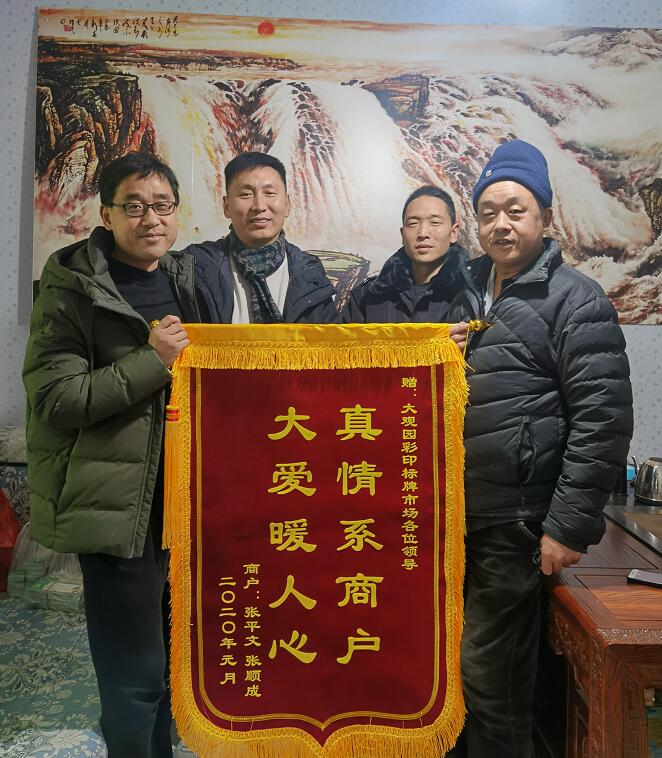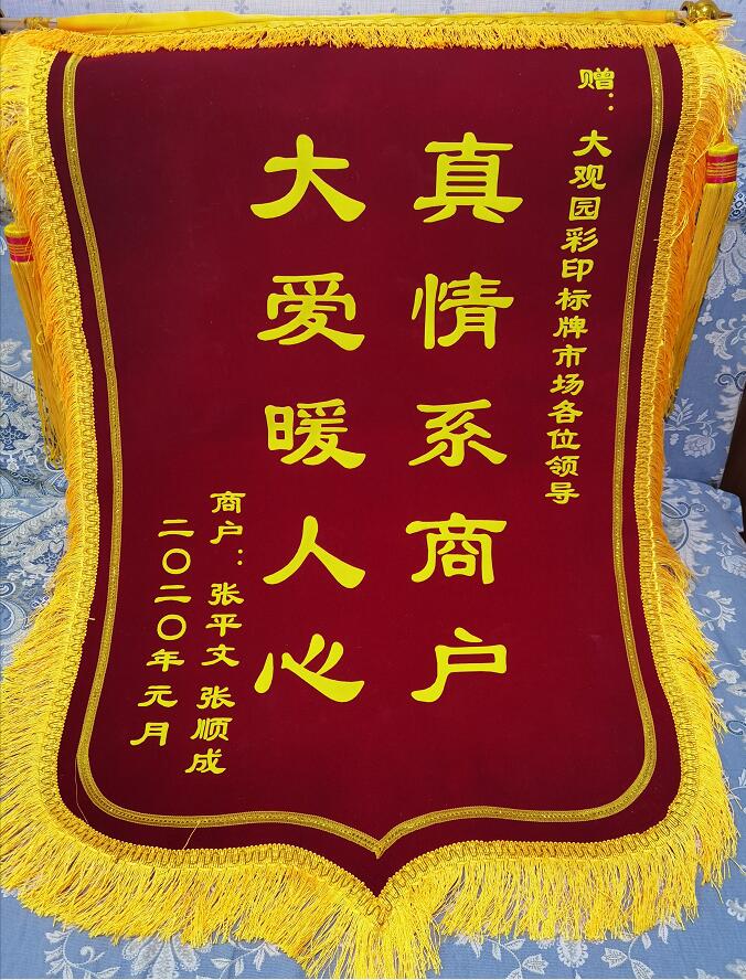 一面锦旗就是一面镜子,它无时无刻不在激励鞭策着市场办的工作人员,“以商户为本、为商户解困”是市场办工作的宗旨和原则,锦旗虽轻,情意浓浓,既蕴藏着商户们对大观园市场的感激与信任,更是对乐于奉献品德的肯定。