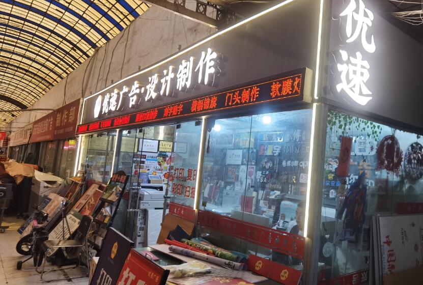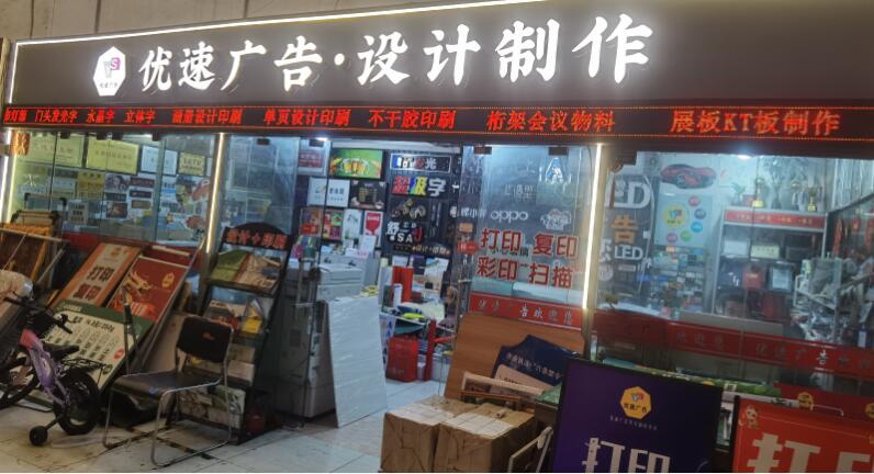 大观园彩印广告市场中排:000.001号优速广告制作部陈朋陈老板,在这个双节的假期也没有闲着,而是利用自己精湛的设计天才给自家更换了新的门头,看看这漂亮的门头字,又亮堂又炫酷,陈老板对我们说,我们搞广告设计的,先要把自家门头设计的漂亮了才能吸引更多的客户来寻求合作,这绝对是行业内的真理,王婆卖瓜也要有自己吹嘘的资本,搞广告设计的,都是直接用显眼包让客户跑着来合作。